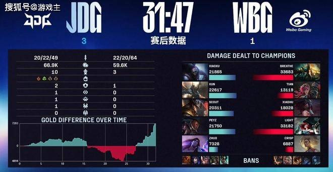 第一局开局仅六分钟,小虎半血的安妮主动出击,结果被草丛蹲伏的xun抓了个正着,不出意外,送出了一血。15分钟的团战应该是一个转折点,jdg战队的中野辅率先开团,peyz团战直接游龙拿到三杀,之后第一局jdg战队就取得了巨大优势,短短28分钟就结束了。第二局比赛前期又是jdg战队野区取得了一定的优势,六分钟的时候,scout越塔击杀了小天,拿到战斗先机,虽然人头被小虎收下,但局势已经开始偏转。虽然在大龙团战中,wbg战队有过不错的决策,但后面还是被jdg战队稳住局势,不到40分钟,拿下BO5的2-0。